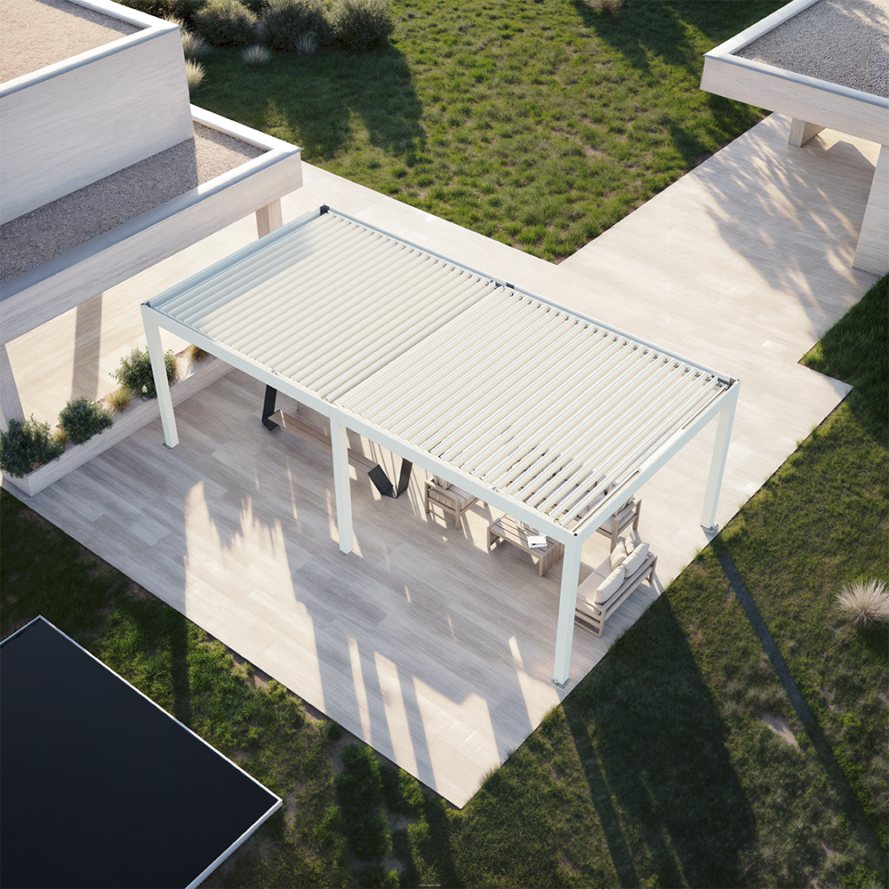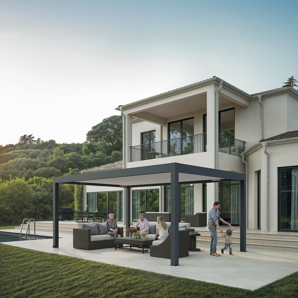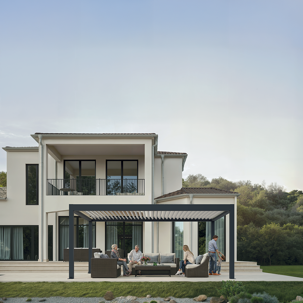 Einfache und praktische Terrassenüberdachungen mit drehbaren Lamellen bieten höchsten Komfort - ob zeitgemäss, klassisch oder modern. Die stranggepressten Aluminiumlamellen sind bis zu 150 ° drehbar, sodass Sie den Sonnenschutz oder die Lüftung nach Ihren Wünschen und Bedürfnissen selbst regeln können.